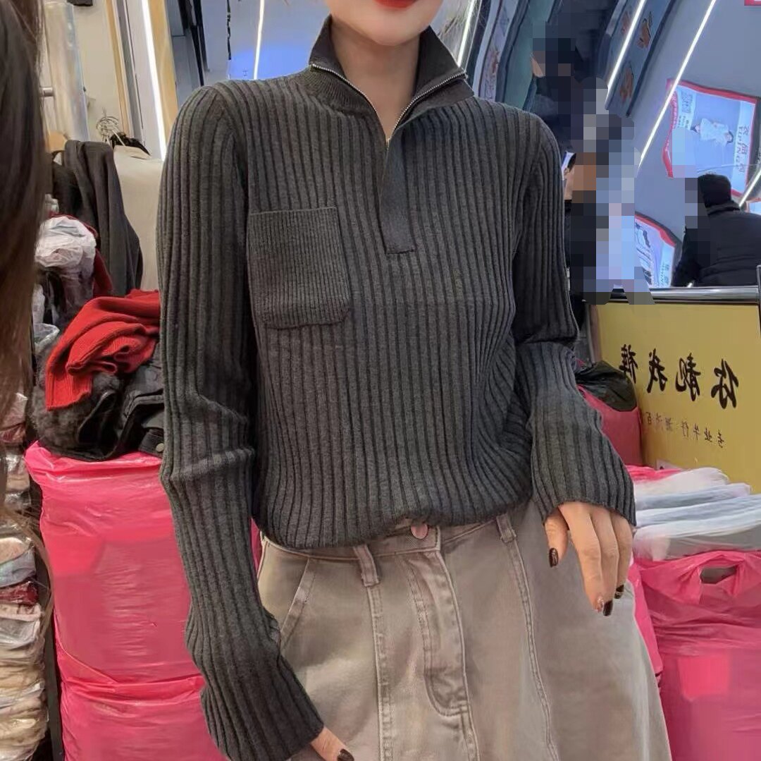 欧货半拉链翻领纯羊毛针织衫女洋气竖条纹柔软套头薄毛衣秋冬新款