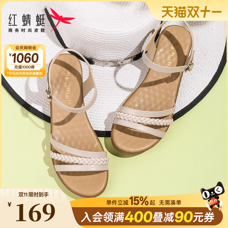 红蜻蜓凉鞋女夏季新款女士一字带中年女鞋子真皮软底坡跟妈妈凉鞋