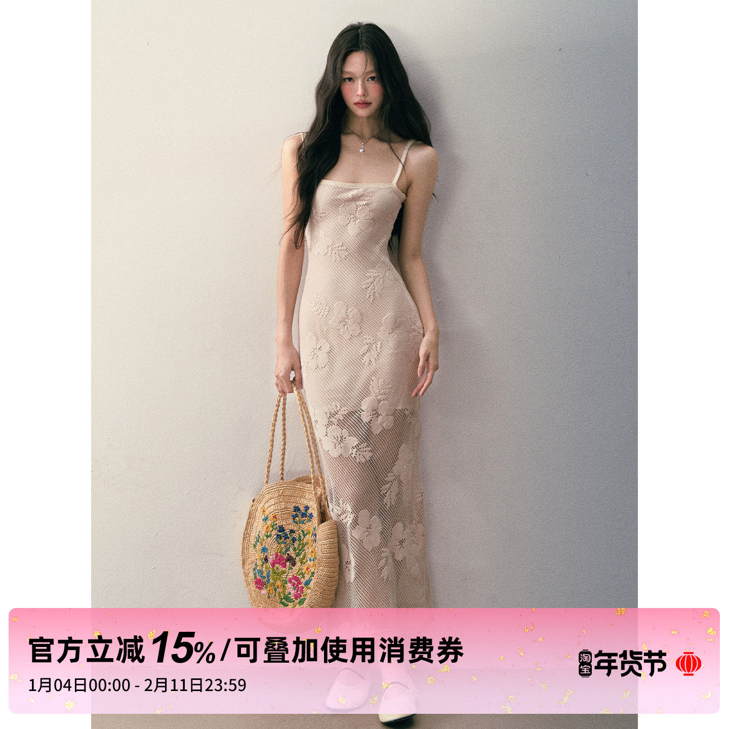 1P STUDIO 杏色花朵镂空肌理吊带连衣裙女秋冬收腰显瘦一字领长裙