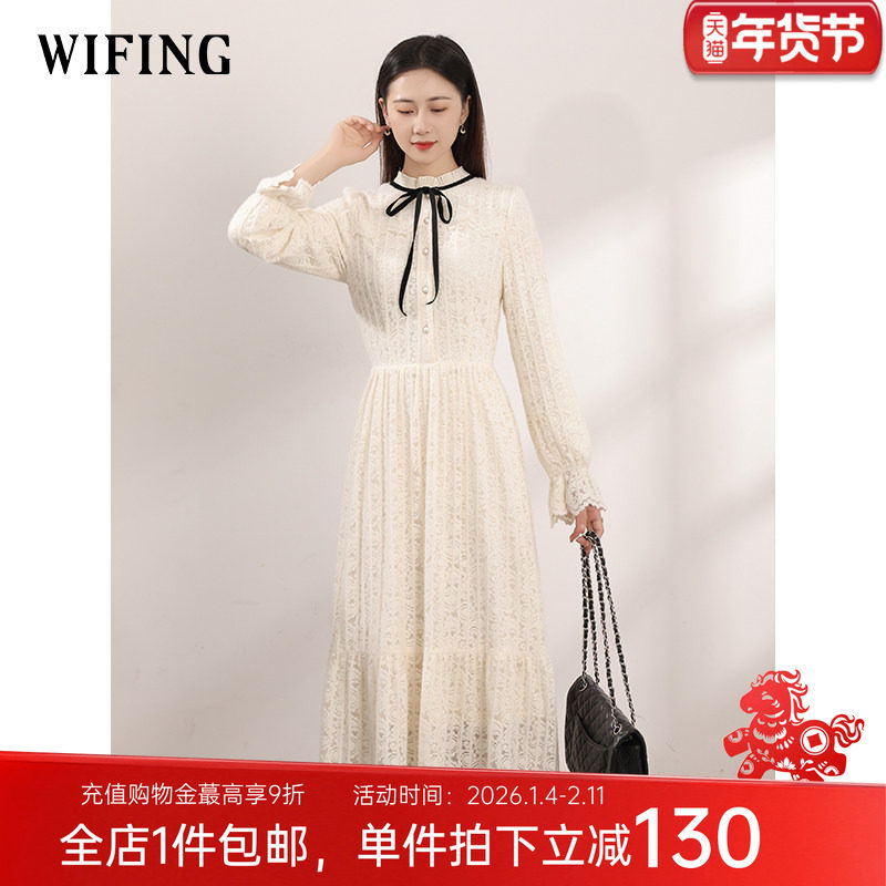 未风杏色蕾丝连衣裙秋冬新款女装轻奢长袖加绒裙子配大衣冬裙长裙