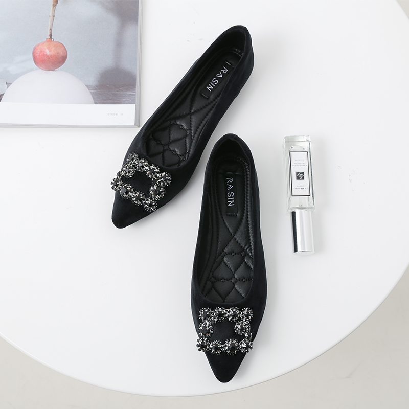 2024秋冬韩版尖头水钻方扣黑色加绒平底单鞋女百搭工作软底瓢鞋女