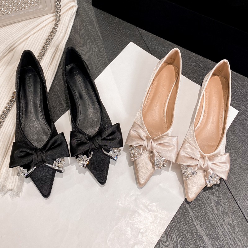 韩版名媛精致仙女珍珠蝴蝶结尖头平底单鞋法式温柔百搭豆豆鞋大码