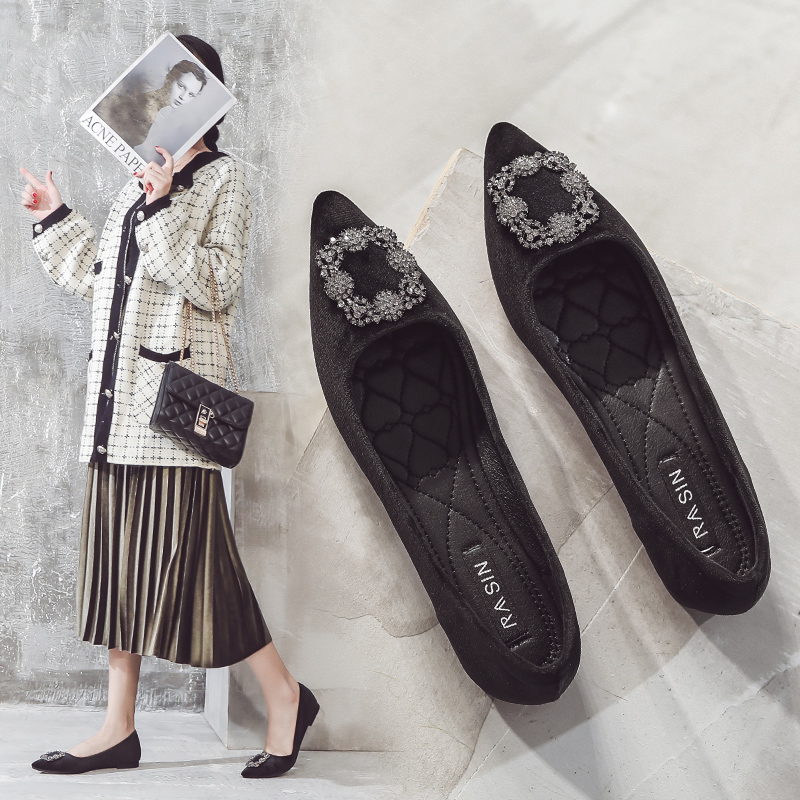 韩版温柔仙女优雅洋气平底单鞋尖头浅口方扣水钻百搭软底飘鞋大码