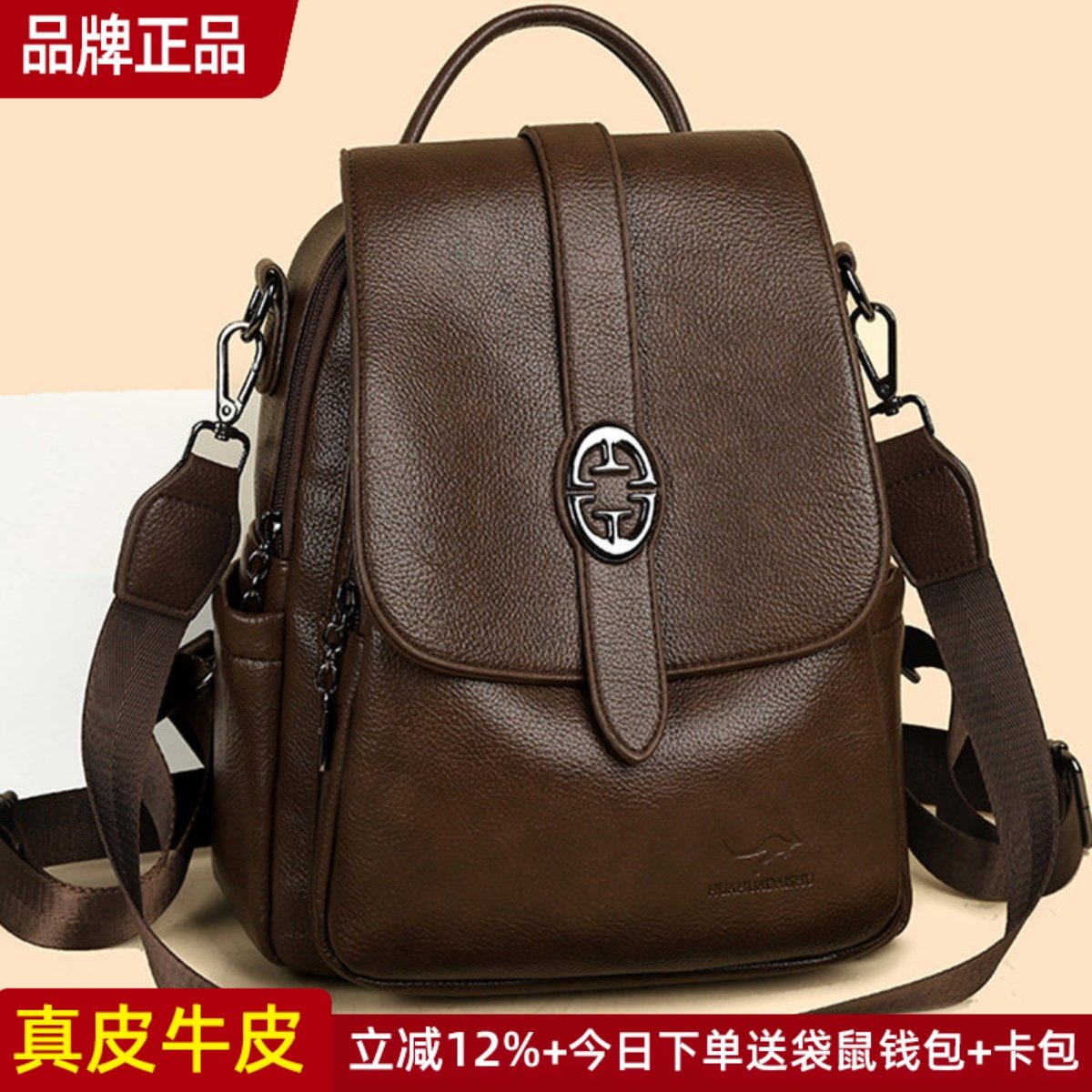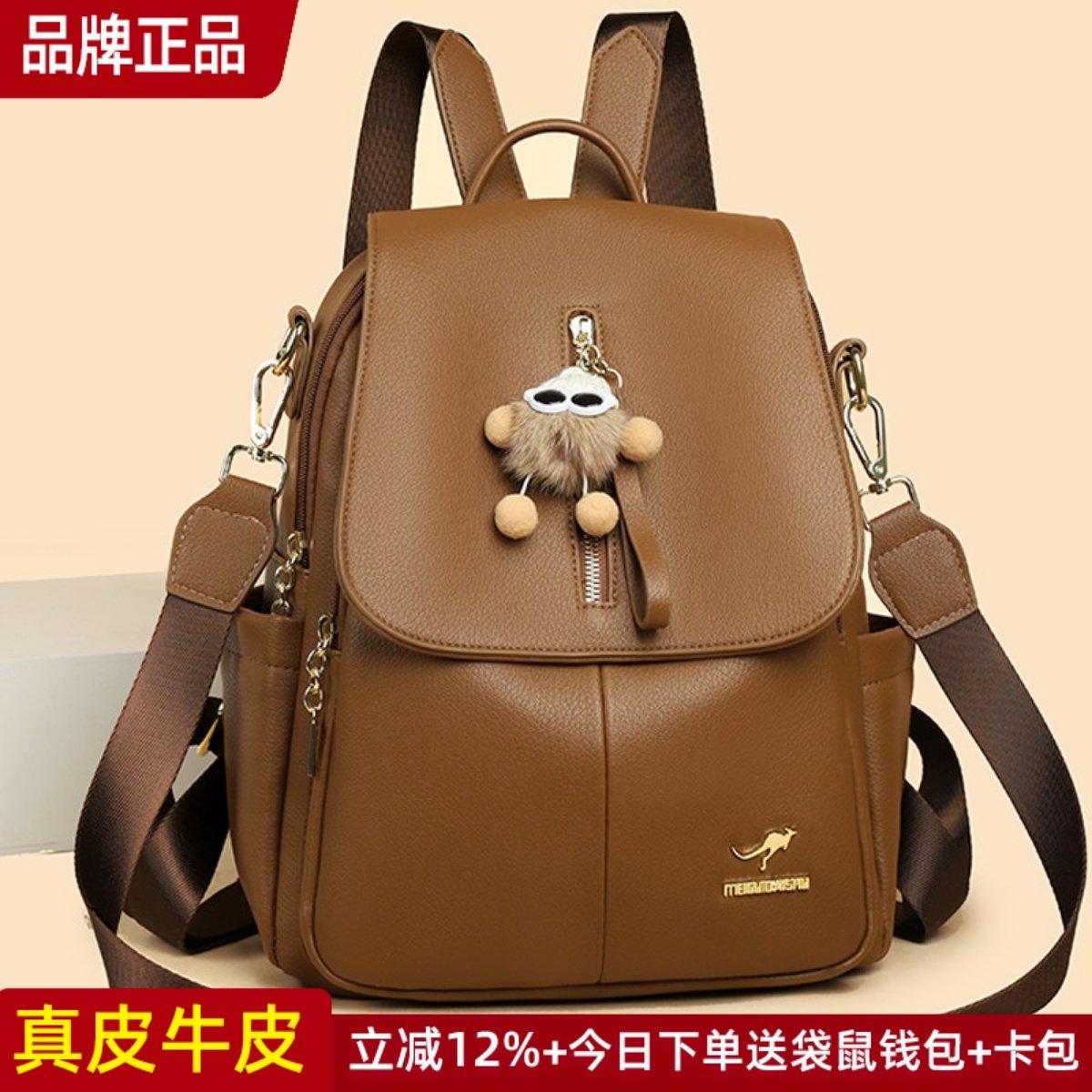 品牌袋鼠真皮双肩包女2025新款旅行背包大容量双肩包轻便双肩背包