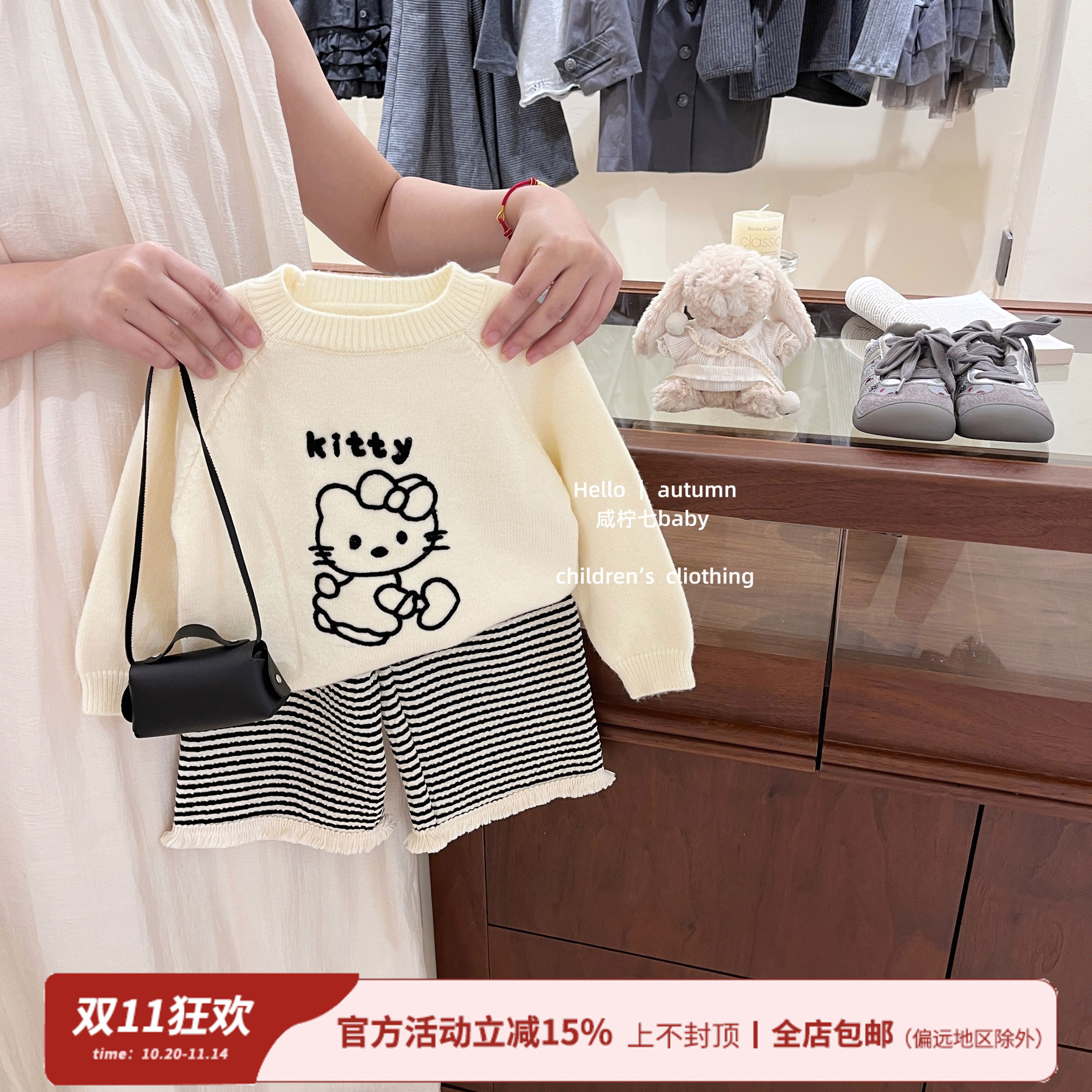 【咸柠七】原创!女童秋冬套装时髦洋气女宝宝kt猫毛衣条纹直筒裤