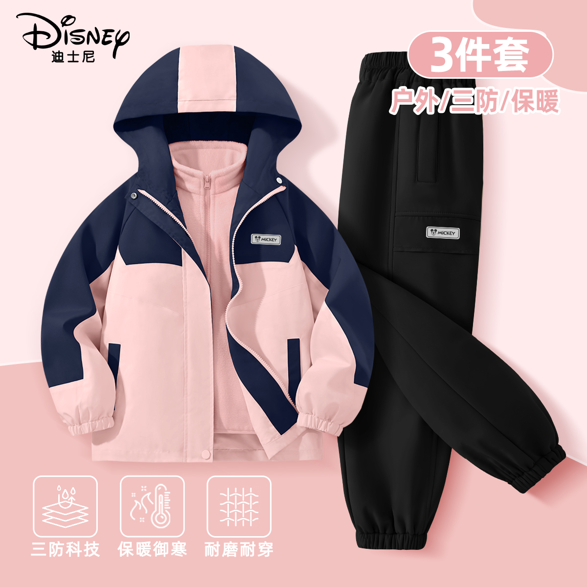 迪士尼女童秋冬套装2025新款三防保暖儿童三合一冲锋加绒工装裤