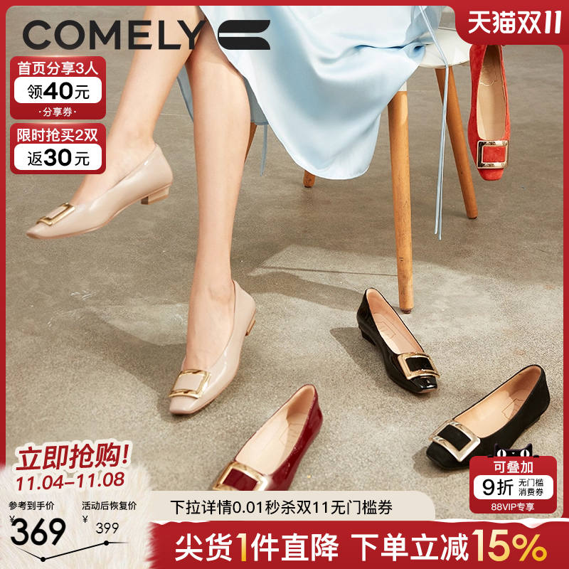 康莉粗跟单鞋女春季新款方扣漆皮气质百搭平底鞋舒适通勤女鞋黑色