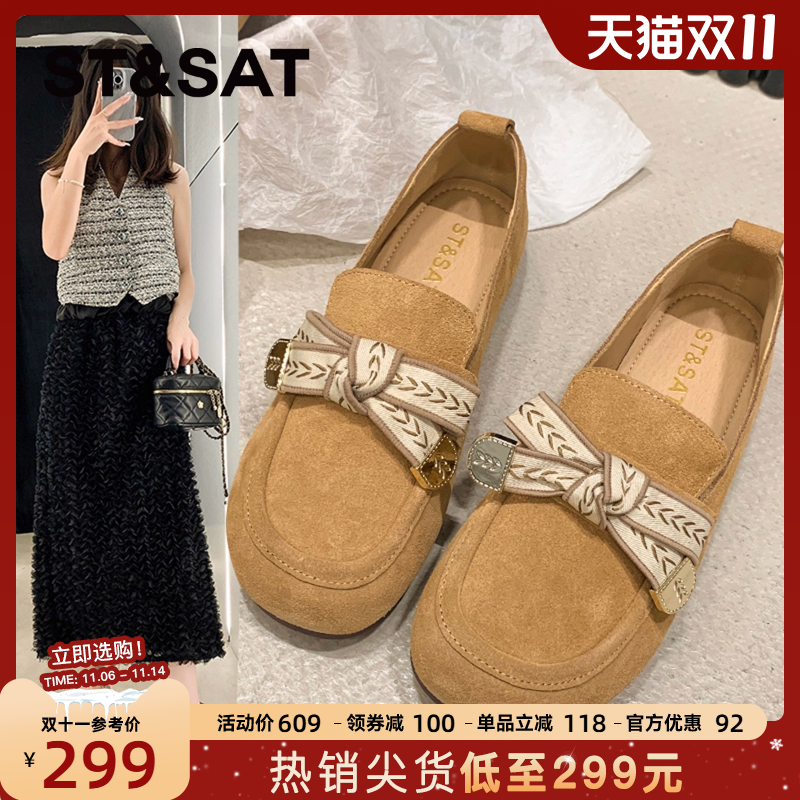 星期六真皮乐福鞋女山茶花新款秋季女鞋平底单鞋英伦风黑色小皮鞋