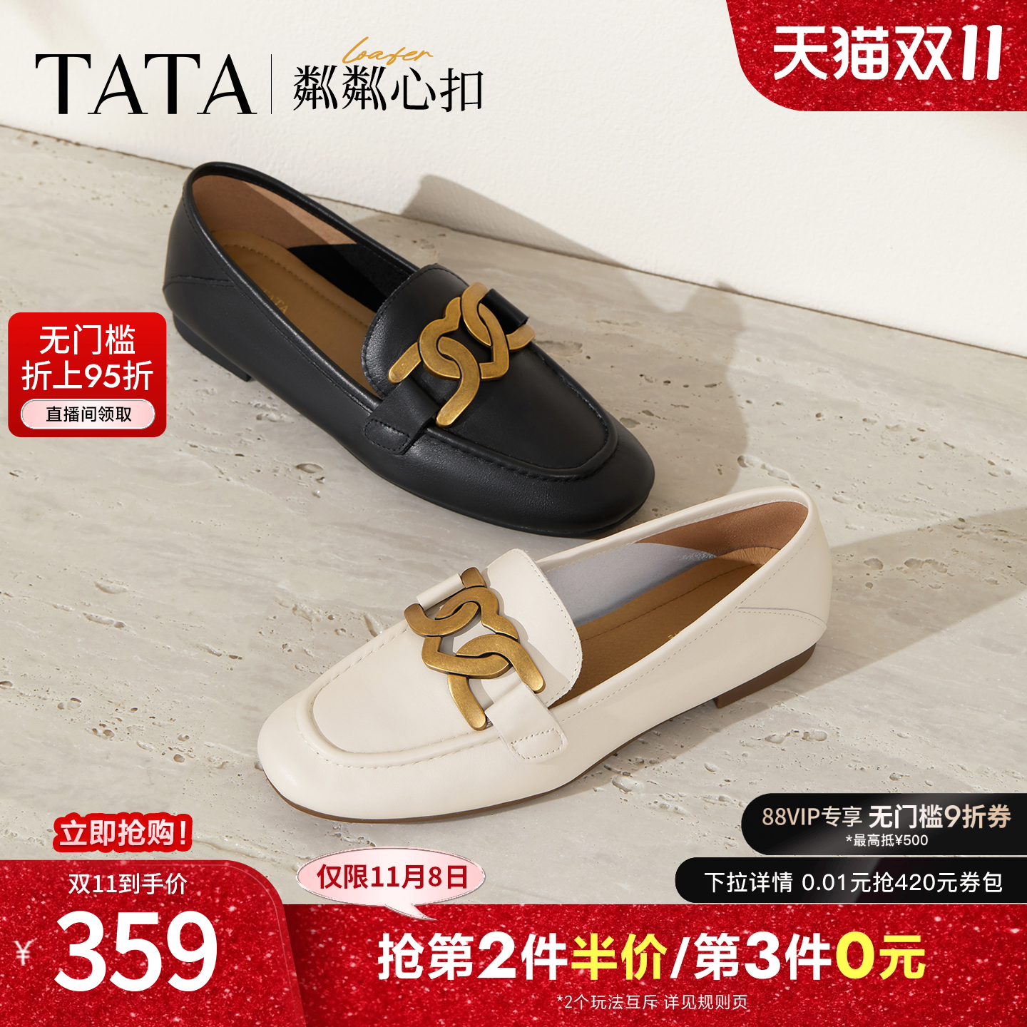 TATA他她粼粼心扣女鞋软底通勤乐福鞋平底单鞋英伦风皮鞋7QC23AA4