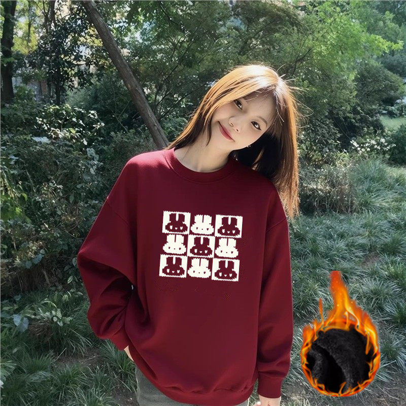 大码酒红加绒情侣套头卫衣女卡通设计感松弛风上衣本命年新年衣服