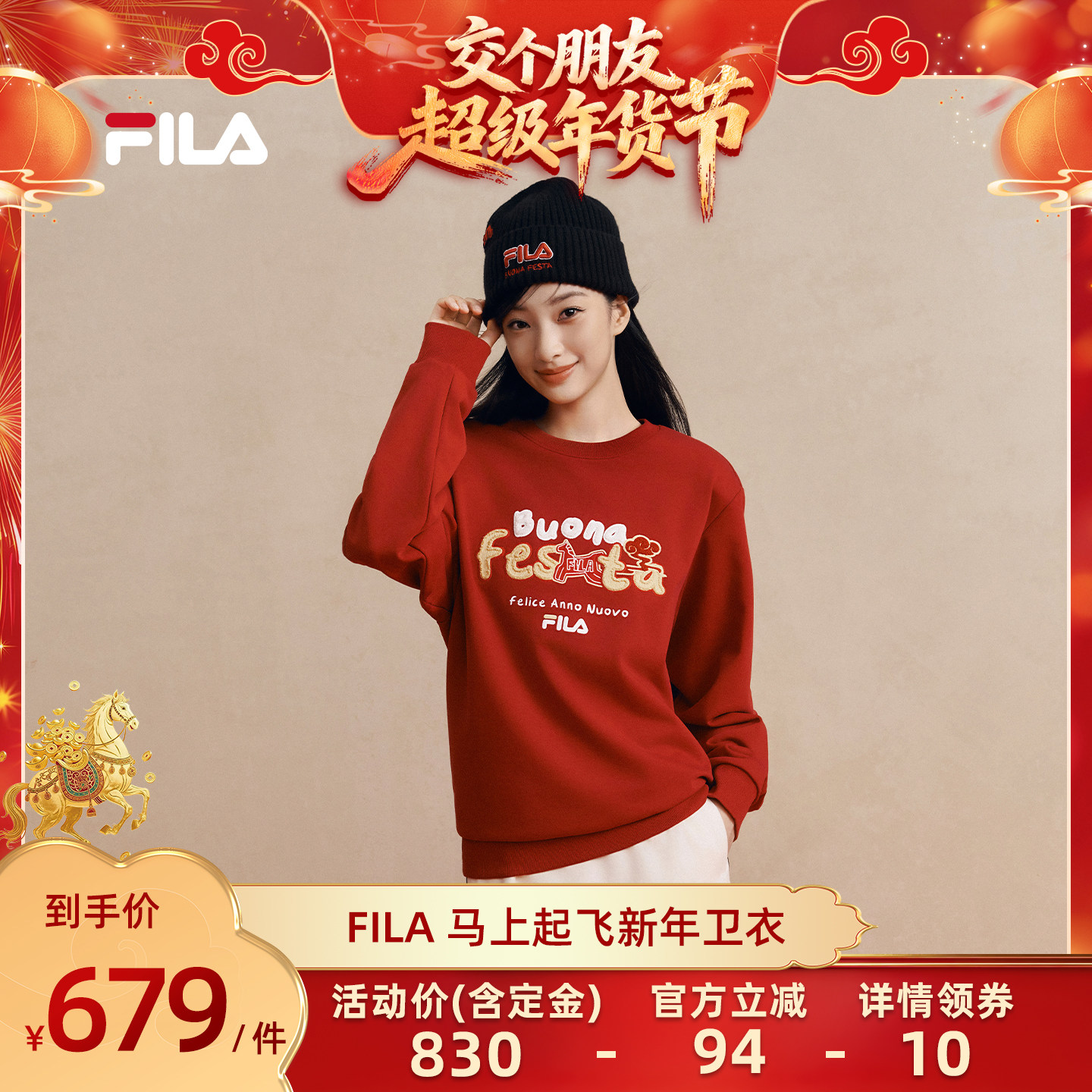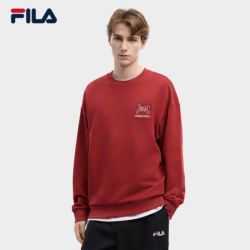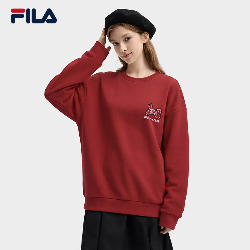 FILA马上起飞抓马卫衣斐乐情侣套头卫衣26春红色新年宽松纯棉上衣