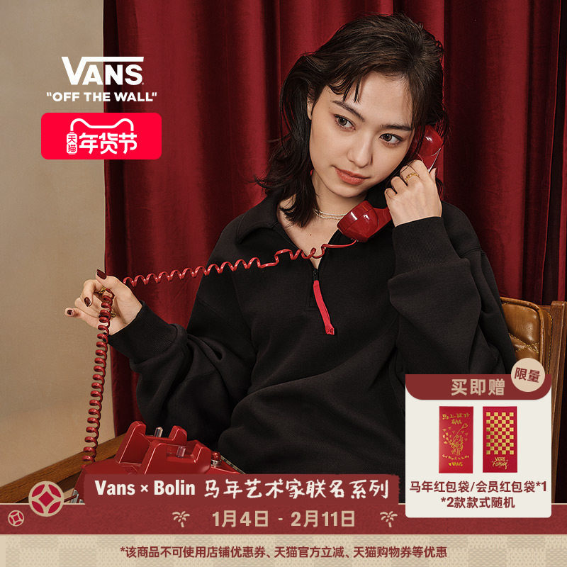 Vans范斯官方 马年生肖款Bolin联名男女情侣套头卫衣黑色半开襟