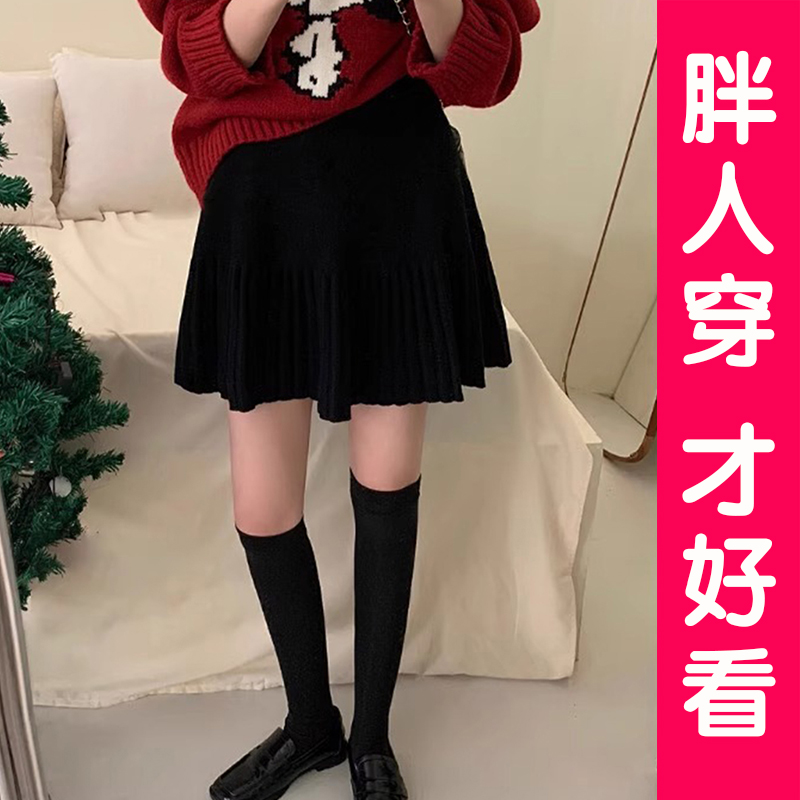 秋冬大码针织短裙胖mm半身裙显瘦A字裙减龄蓬蓬裙200斤学生百褶裙