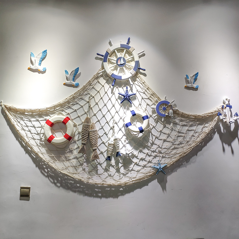 地中海风格装饰挂件渔网麻绳照片墙餐厅墙面背景墙幼儿园场景布置