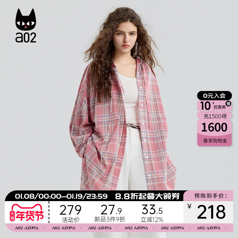 a02宽松长款连帽衬衫女2025新款秋季格子衬衣外套设计感秋装上衣