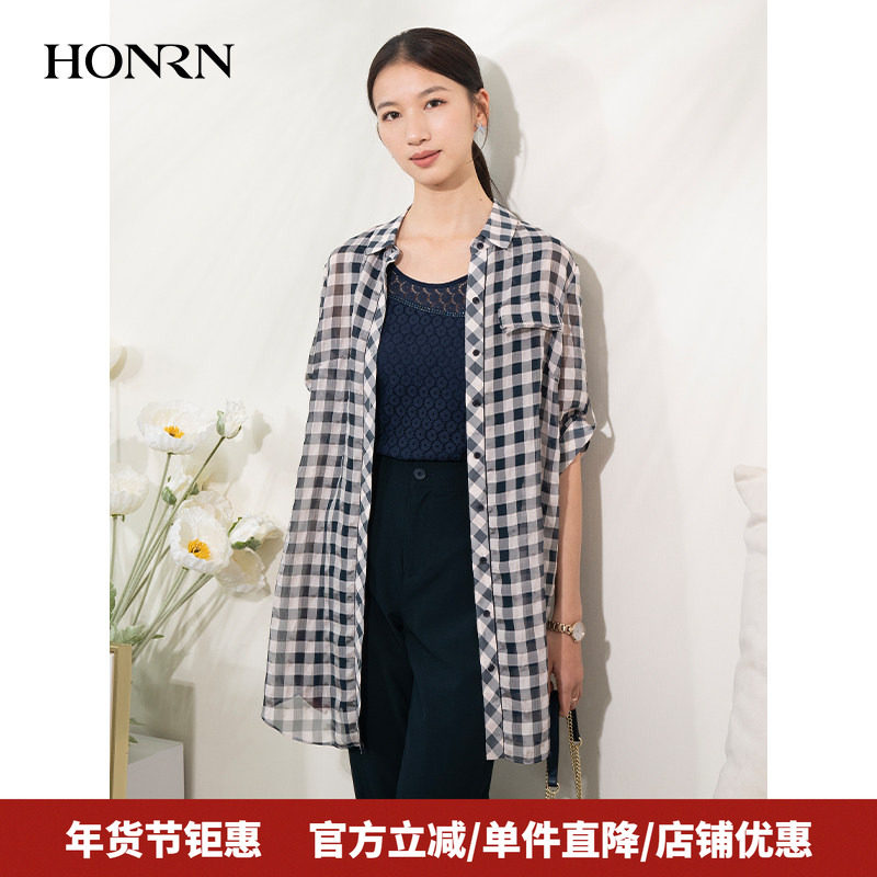 HONRN/红人宽松休闲薄款中长款格子衬衣衬衫女上衣夏季HI22OC577