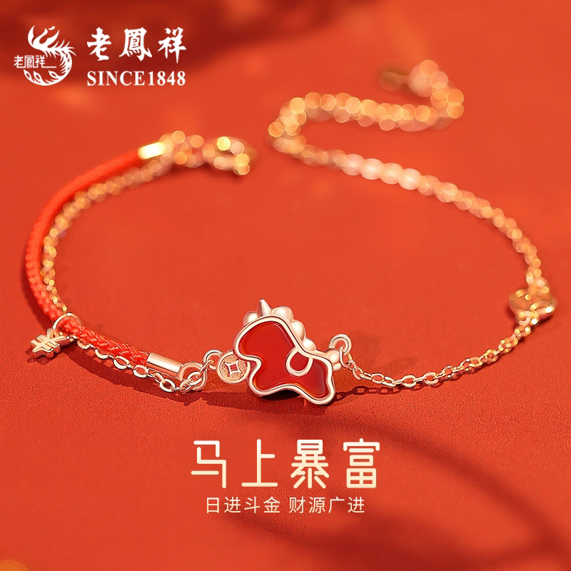 老凤祥小马银手链女新款马上有钱红玛瑙s925银本命年礼物送女友