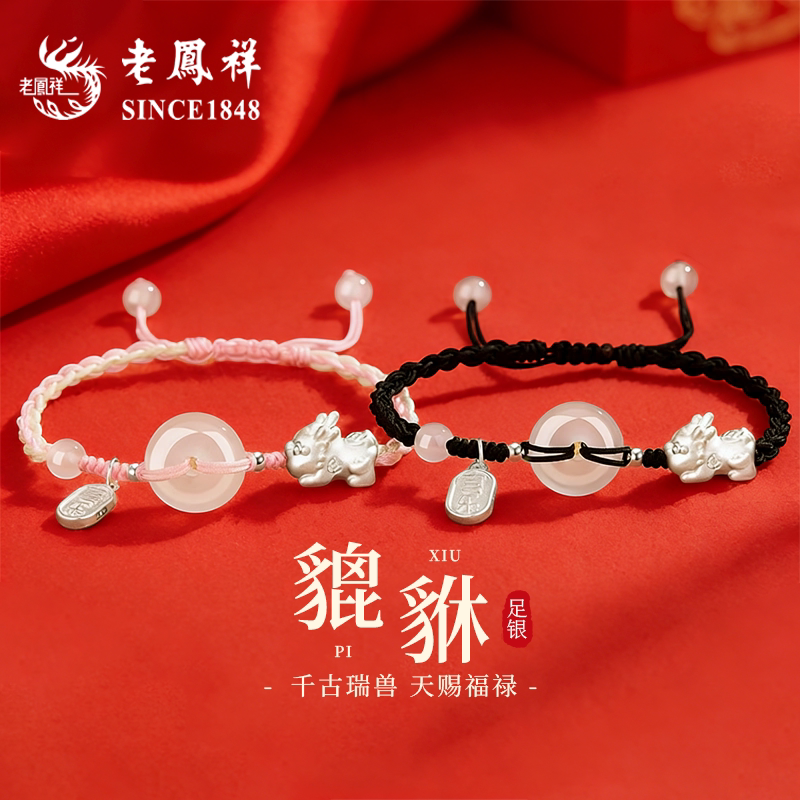 老凤祥足银平安扣貔貅情侣款手链女款纯银编织手绳生日礼物送女友