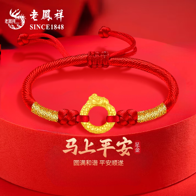 老凤祥黄金生肖马手链足金平安扣小马红手绳本命年生日礼物送女友
