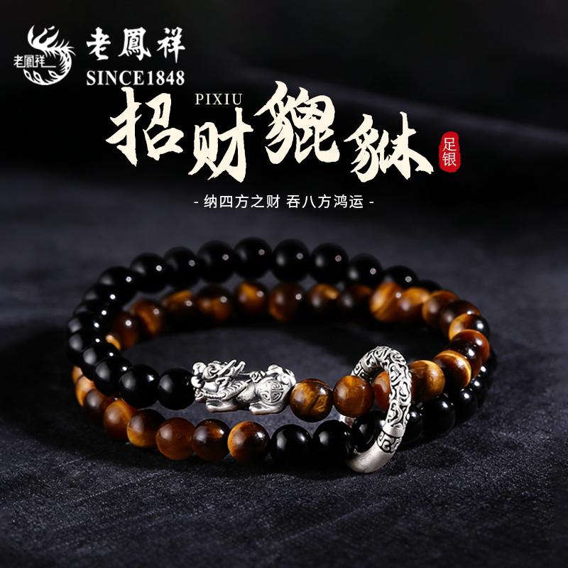 老凤祥足银招财貔貅平安扣双层手串男款虎眼石手链生日礼物送男友
