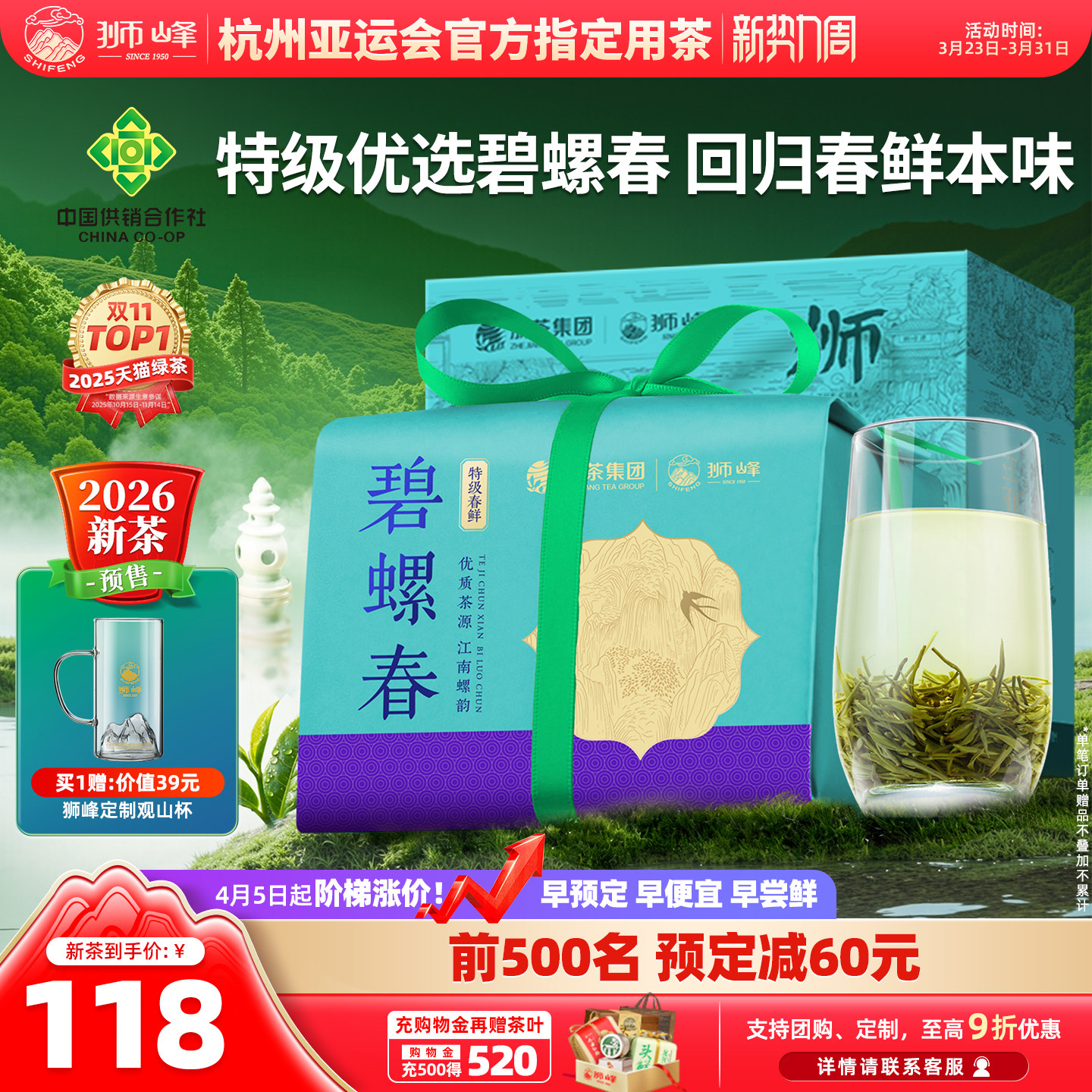 狮峰牌碧螺春2026新茶预售特级明前头采春绿茶叶自己喝官方旗舰店