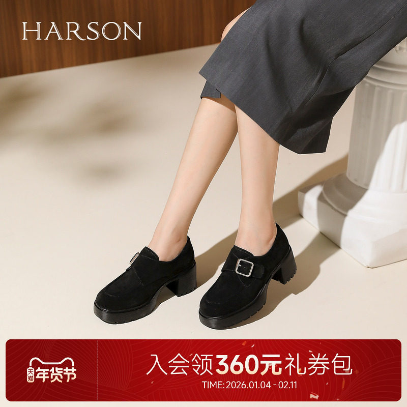 哈森复古绒面深口单鞋皮带扣黑色皮鞋粗高跟女鞋2025新款HL257131