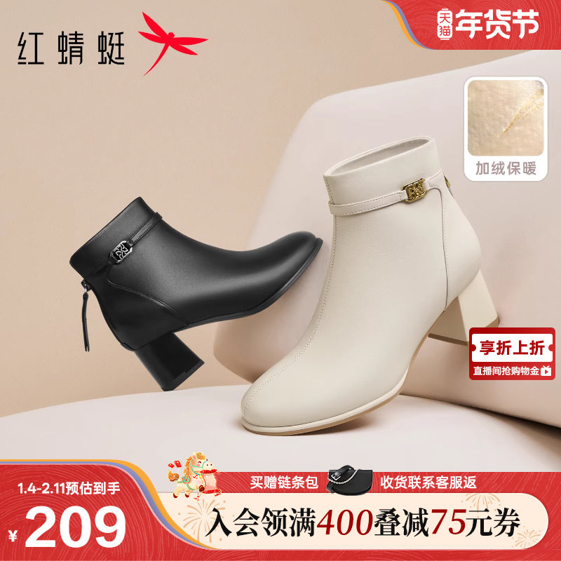 红蜻蜓高跟妈妈鞋子冬季女鞋白色粗跟女靴加绒保暖皮鞋羊皮棉靴子
