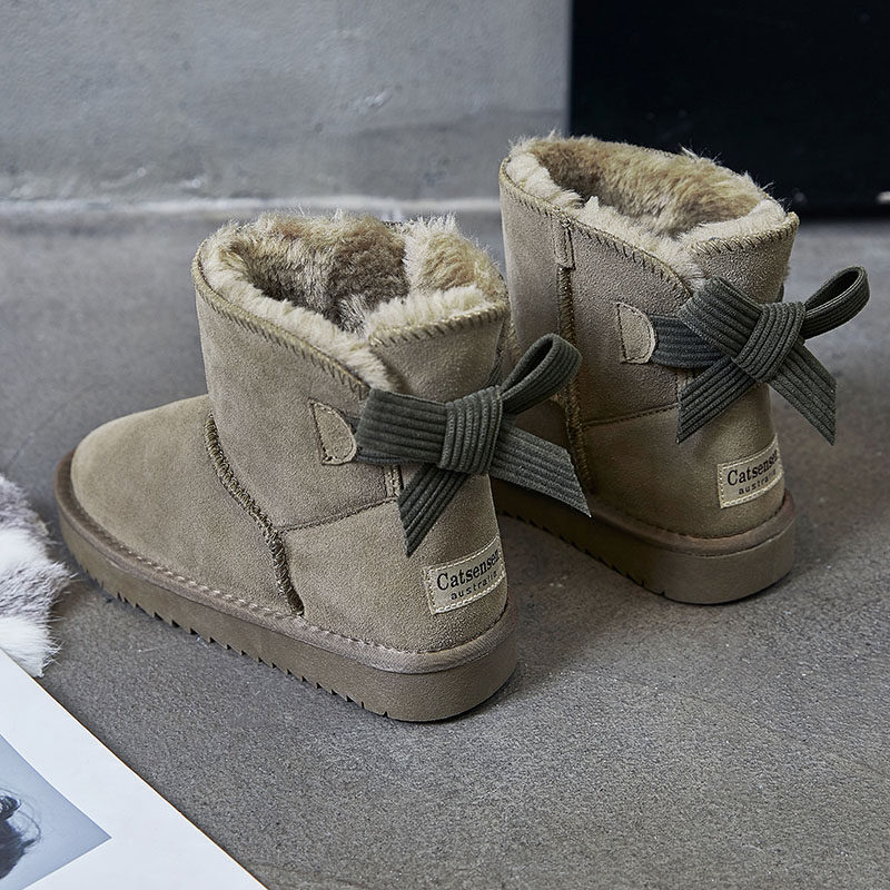 新款蝴蝶结真皮雪地靴女短筒冬季2024加绒保暖短靴子学生防滑棉鞋