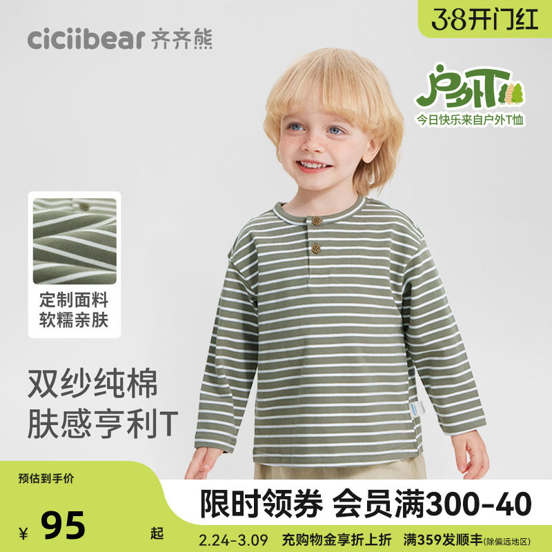[纯棉亨利T]齐齐熊宝宝t恤长袖秋款男童体恤儿童条纹打底衫上衣女