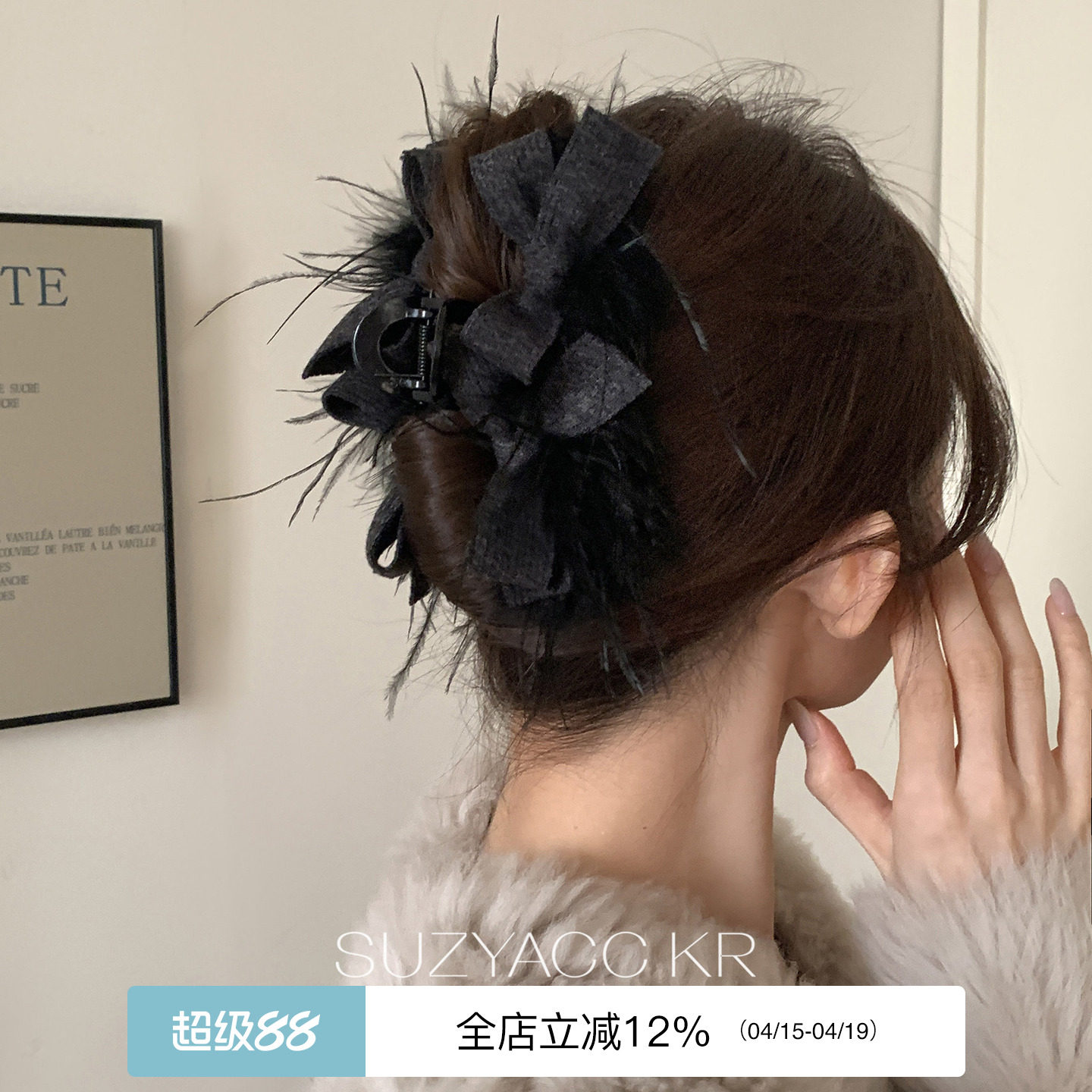 suzyacc kr蓬松氛围感蝴蝶结羽毛抓夹超大号气质小众高级感盘发夹