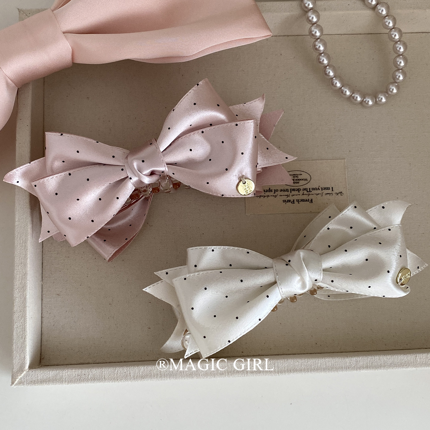 原创粉色缎面波点蝴蝶结香蕉夹发饰女大号发夹抓夹马尾夹发卡头饰