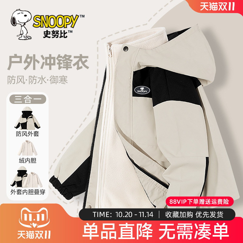 史努比男童冲锋衣外套春秋2025新款三合一户外登山服儿童春装上衣
