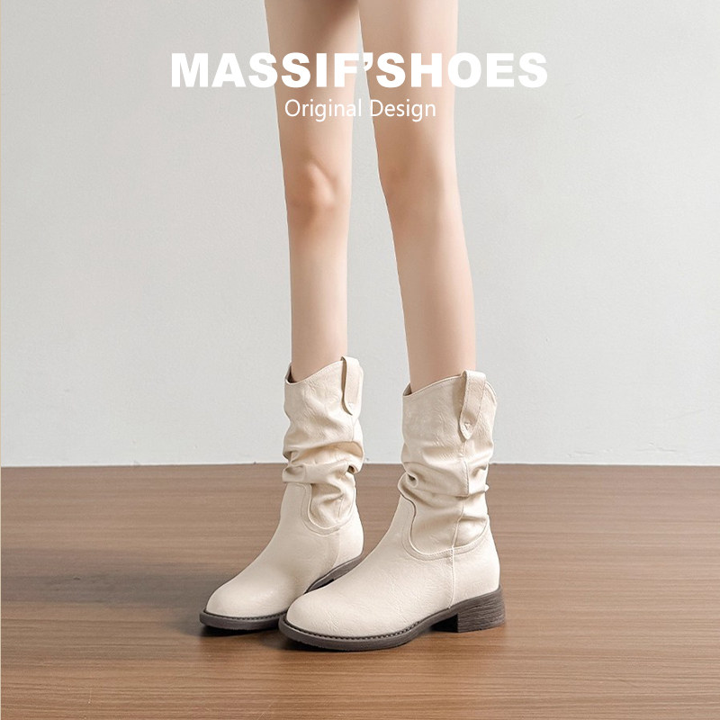 真皮白色短靴女2026新款秋冬加绒粗跟复古褶皱堆堆靴内增高马丁靴