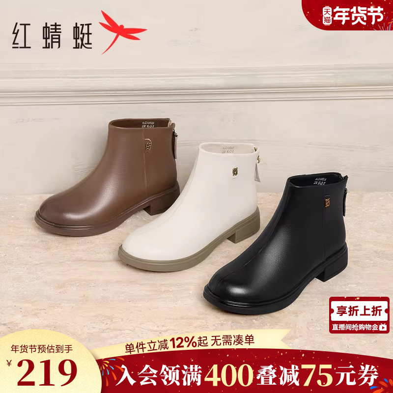 红蜻蜓真皮白色短靴女冬季新款女鞋皮靴复古英伦风皮鞋女时装靴子