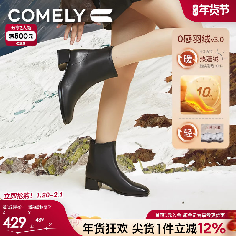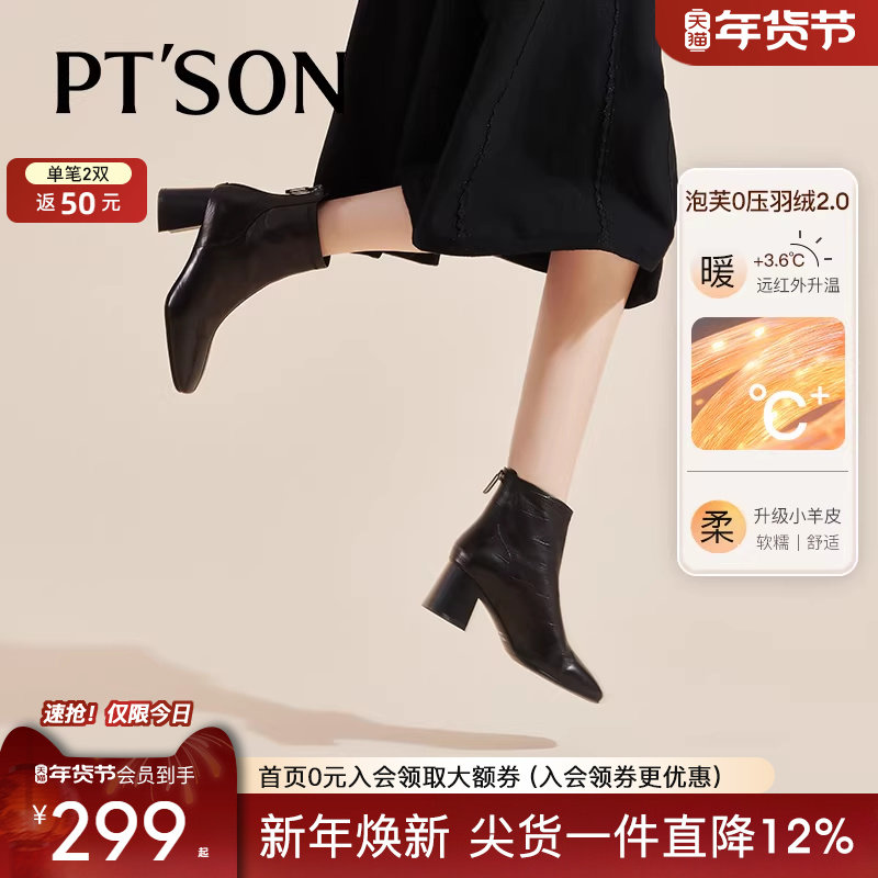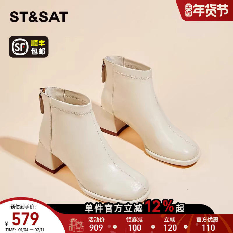 商场同款百田森法式方头鞋子秋冬高级感羊皮羽绒里粗跟白色短靴女