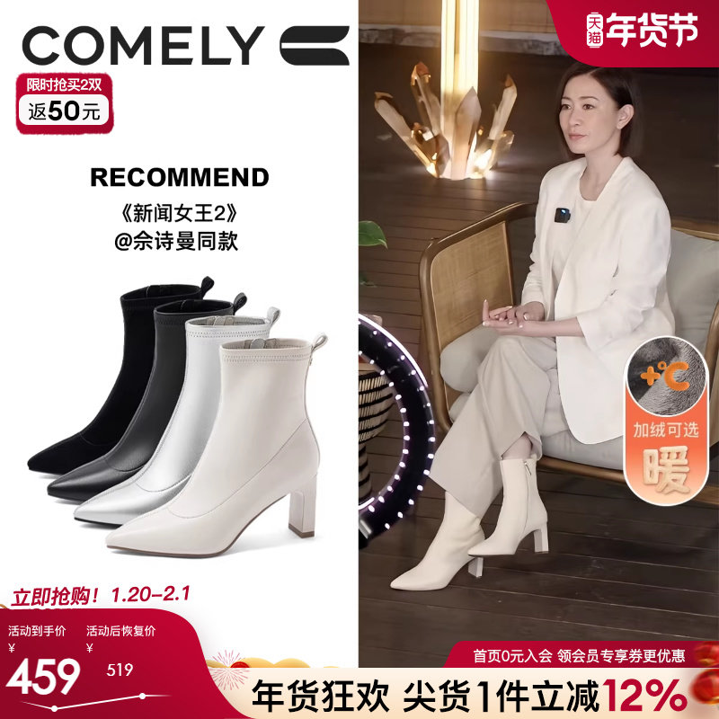 新闻女王佘诗曼同款康莉高跟白色短靴女冬新款真皮气质尖头瘦瘦靴