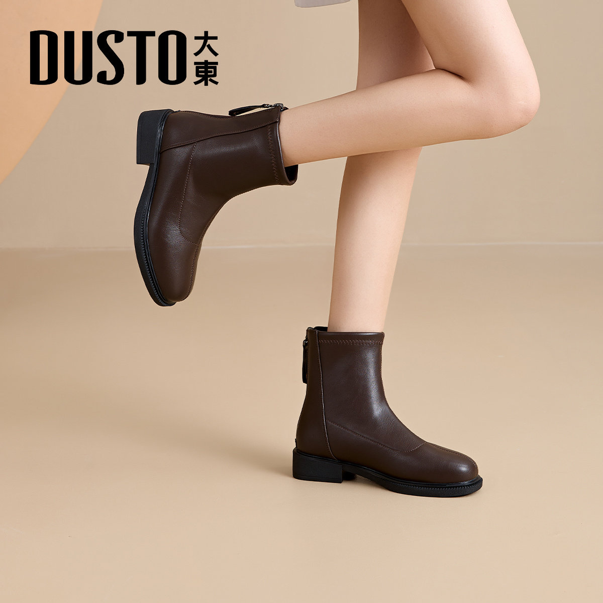 大东官方白色短靴女2025新款法式小裸靴加绒粗跟靴子切尔西瘦瘦靴
