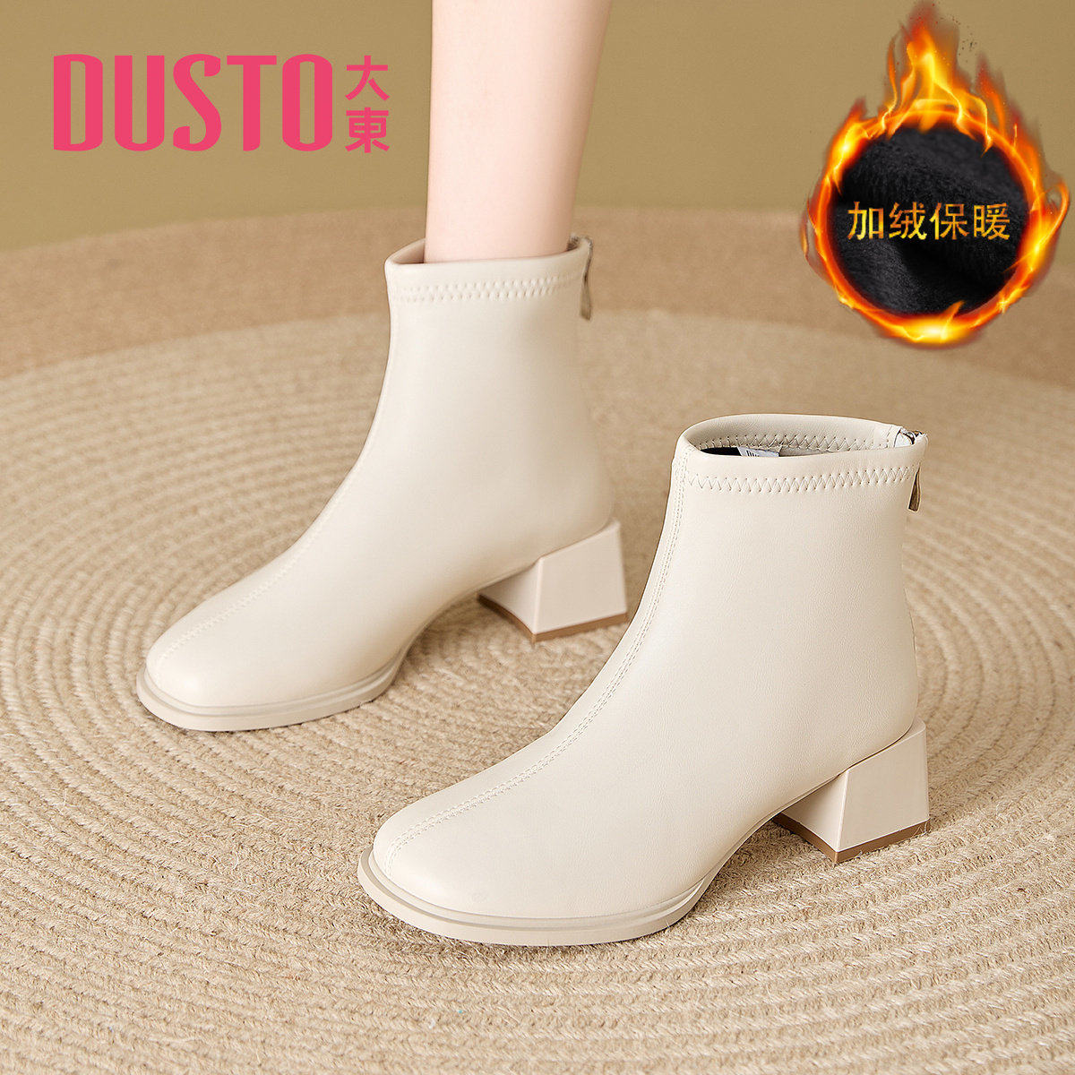 大东白色短靴女2026新款秋冬加绒方头粗跟高跟靴法式靴子切尔西靴