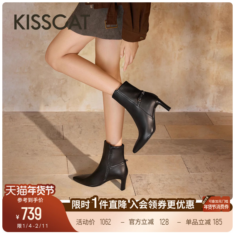 KISSCAT接吻猫舒适优雅尖头高跟靴粗跟法式真皮白色短靴女