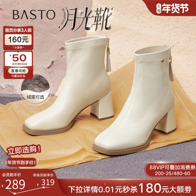 【月光靴】百思图25冬商场新款高跟白色短靴加绒法式瘦瘦小踝靴女