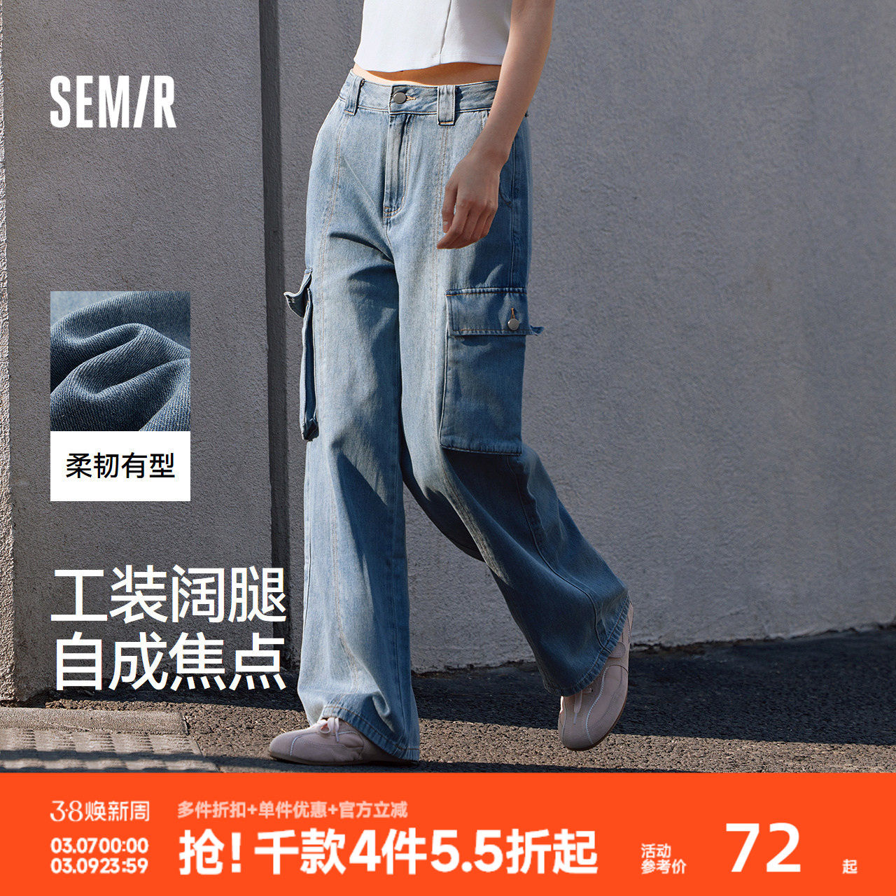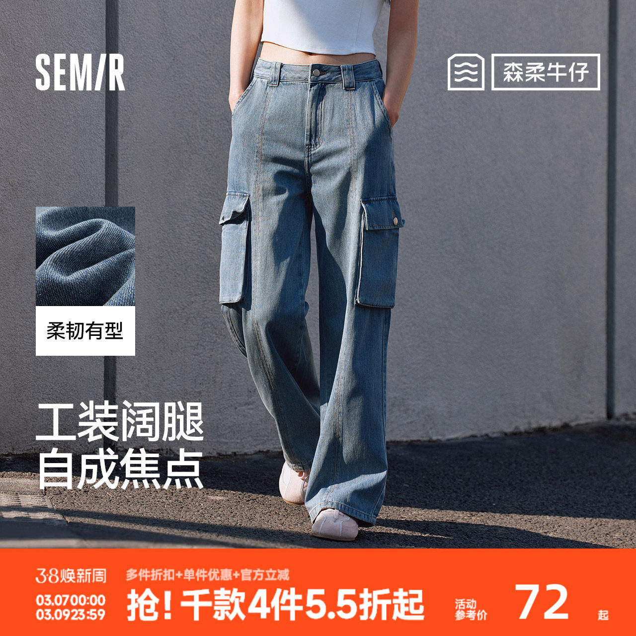 森柔牛仔|森马牛仔裤女水洗阔腿裤个性夏季显腿长工装裤潮酷炸街