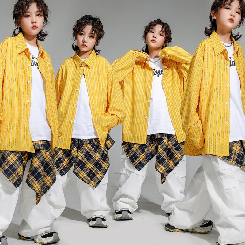 男孩嘻哈街舞潮服黄颜色长袖衬衣套装hiphop炸街儿童演出服装潮牌