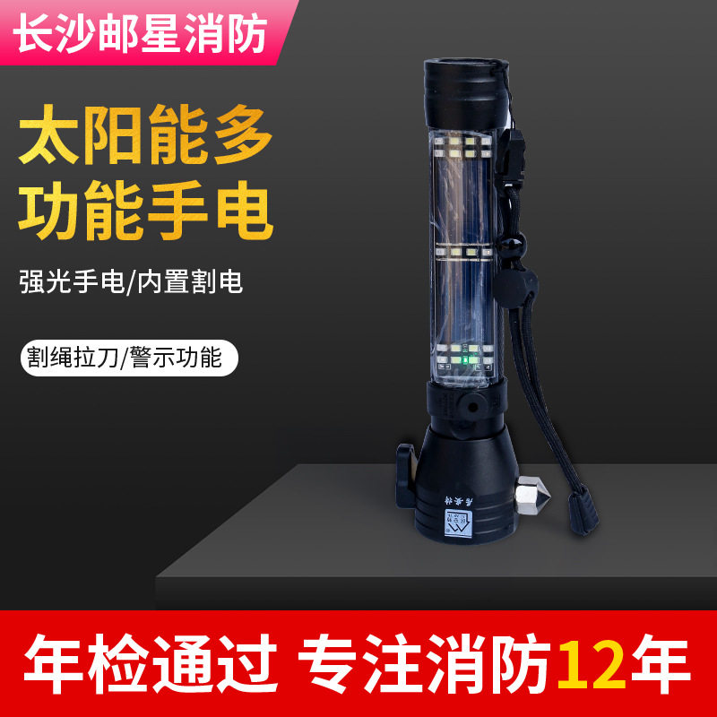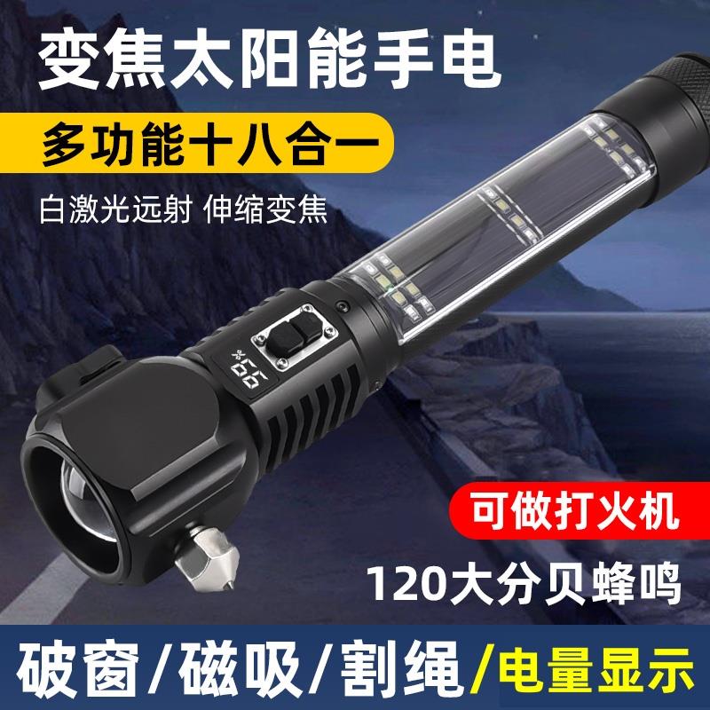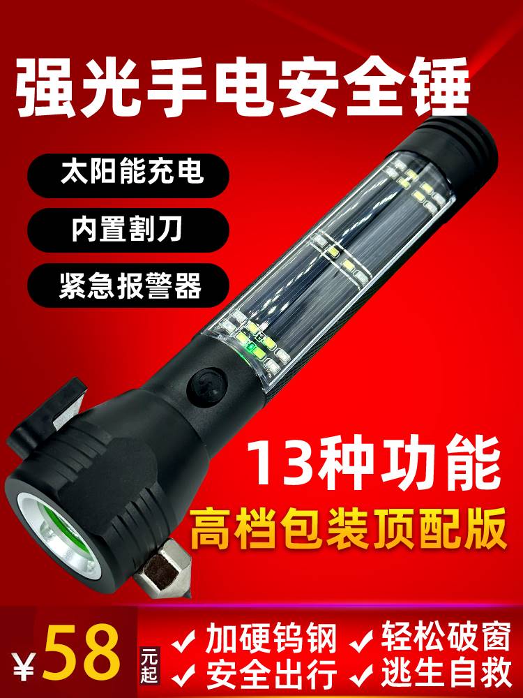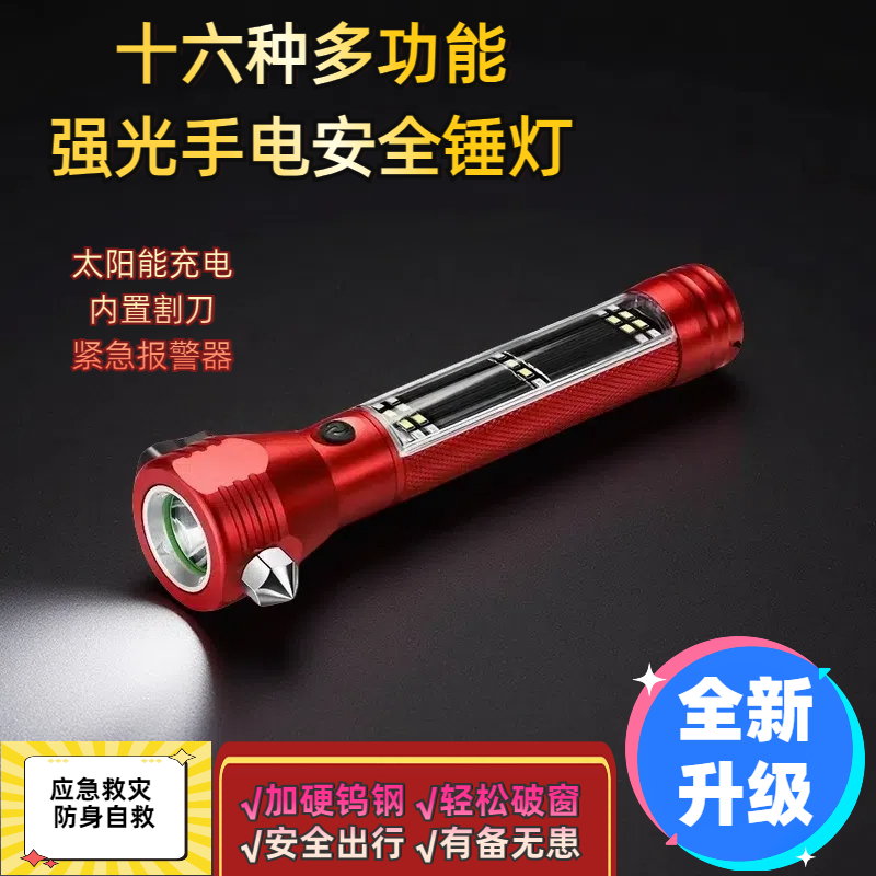 太阳能手电筒强光防身末日求生战备自卫多功能安全锤车载破窗逃生