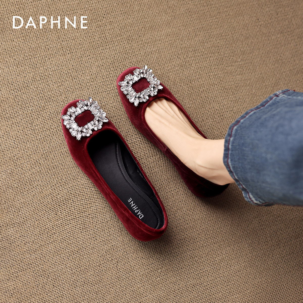 达芙妮酒红色单鞋女2025新款秋季平底方扣水钻浅口鞋秀禾新娘婚鞋