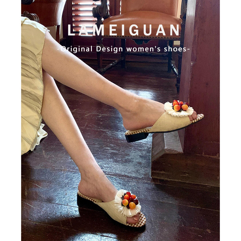 甜美水果花饰粗跟露趾拖鞋女夏季外穿2025新款法式绝美一脚蹬凉鞋