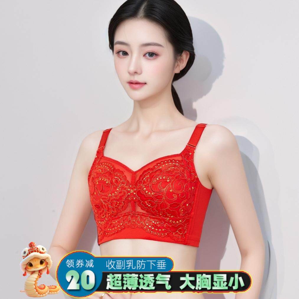 有钢圈薄款抹胸文胸罩聚拢大胸胖收副乳大红色本命年结婚内衣套装