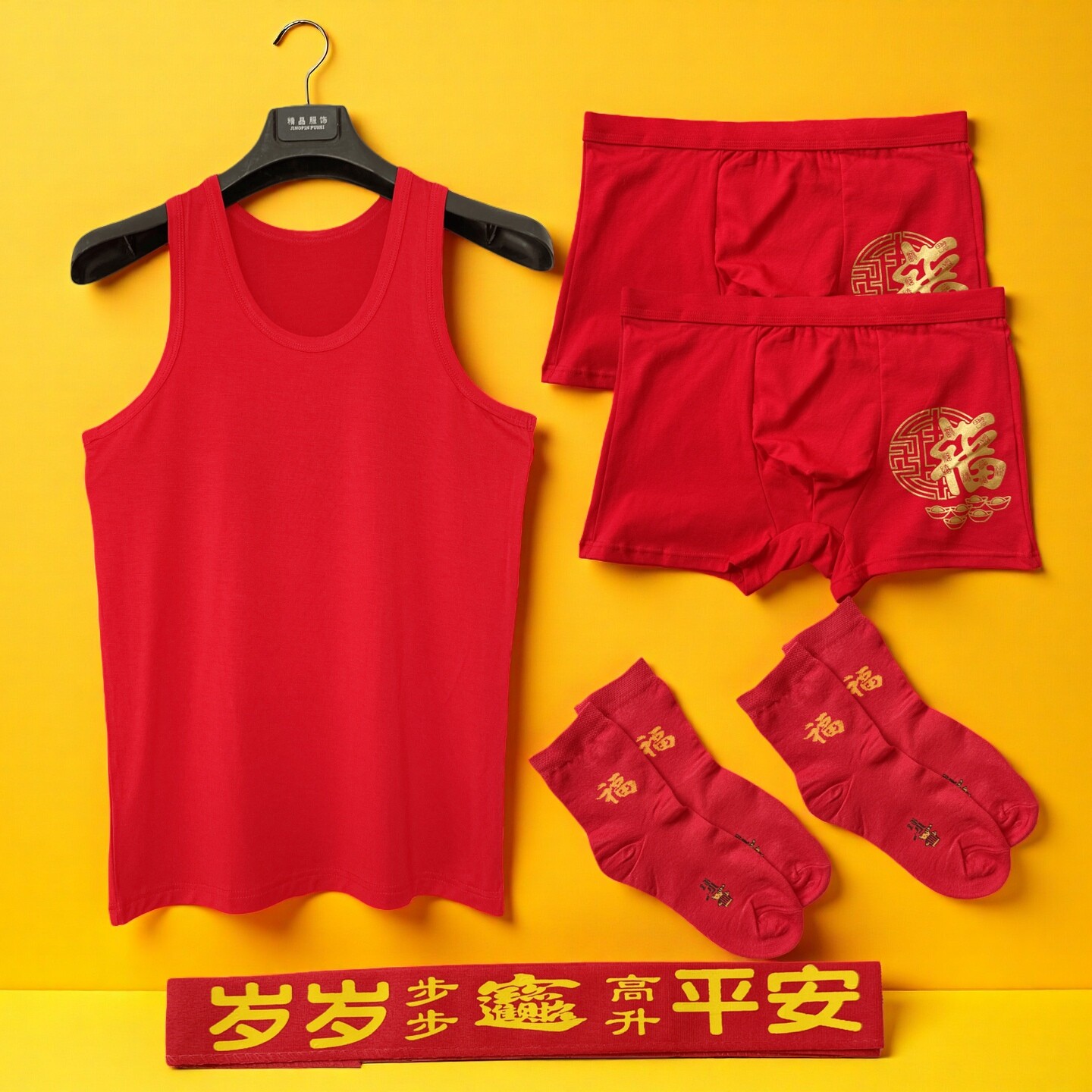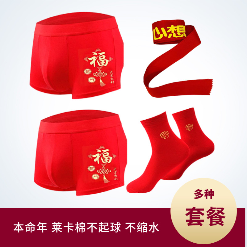红色内裤男本命年红腰带袜子结婚内衣套装莫代尔平角裤莱卡棉裤头