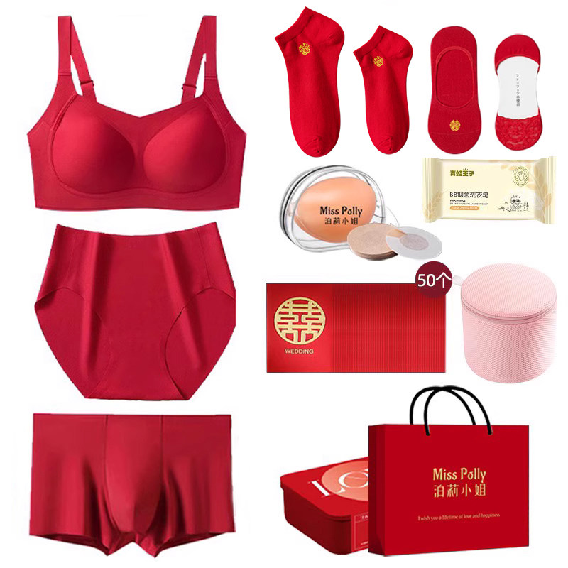甜筒宇宙结婚内衣套装情侣红色衣裤一对新娘酒红文胸U领礼盒礼袋