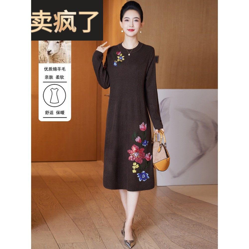 秋装女款2025年新款国风刺绣针织连衣裙中长款遮肚子羊毛毛衣裙子