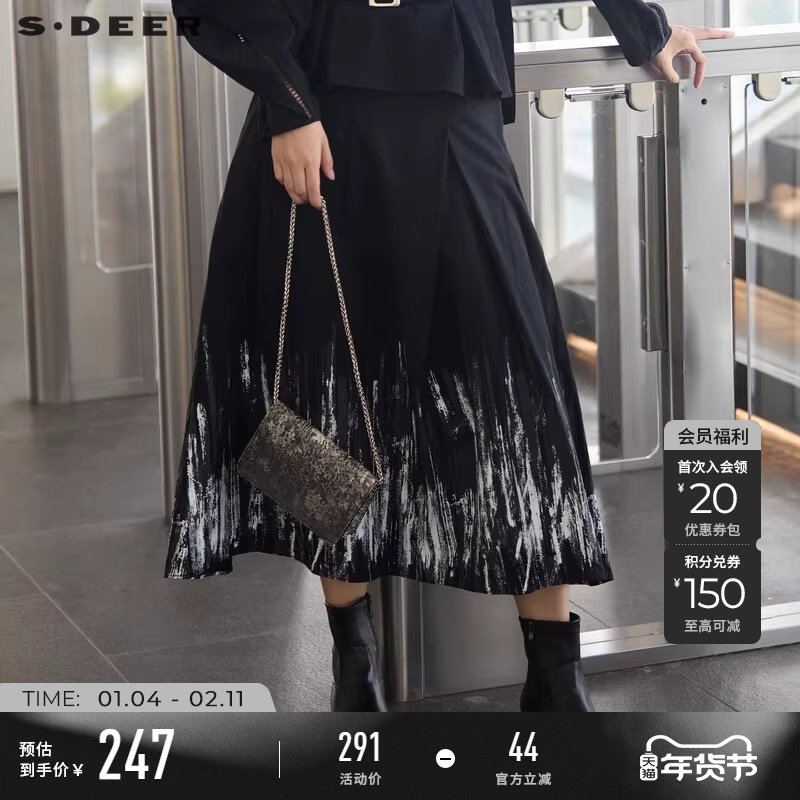 sdeer圣迪奥春秋装女装休闲拼接收腰百褶黑色半身裙长裙S233Z1133